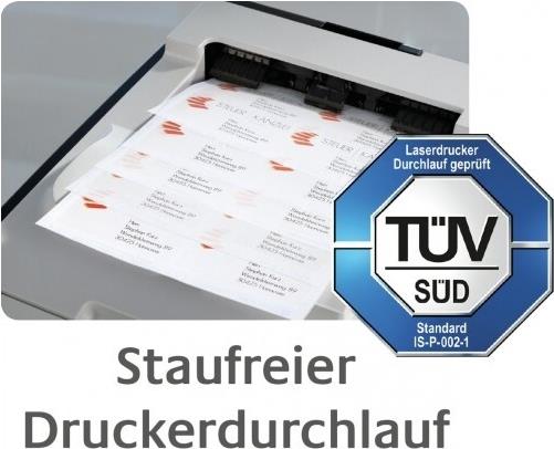 Das Universaletiketten-Obermaterial besteht aus 100% chlorfrei gebleichtem Altpapier. Bei der Herstellung entstehen weniger Emissionen, die Produktionsabfälle werden komplett wiederverwertet. Die Etiketten sind für alle gängigen Laser- und Inkjet-Drucker geeignet. Der problemlose Etikettendruck auf Laserdruckern wurde sogar vom TÜV SÜD getestet und bestätigt. Unsere 4-seitige QCT-Sicherheitskante (Quattro-Clean-Technology) verhindert außerdem Klebstoffablagerungen im Drucker.