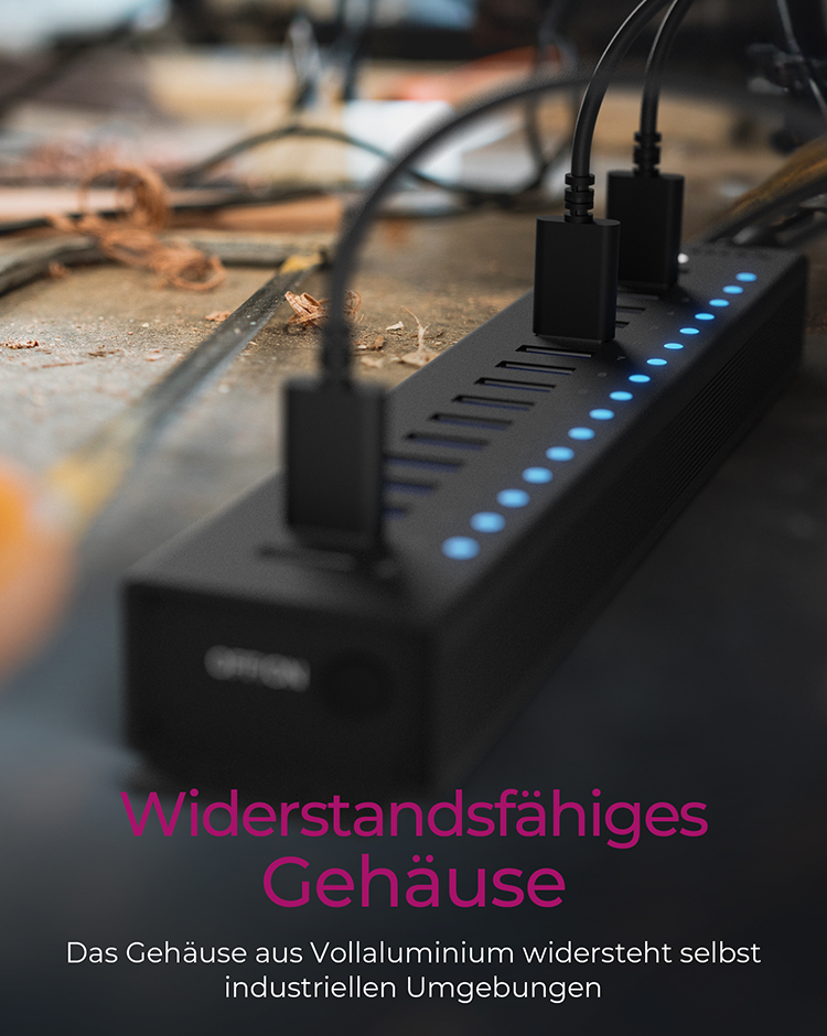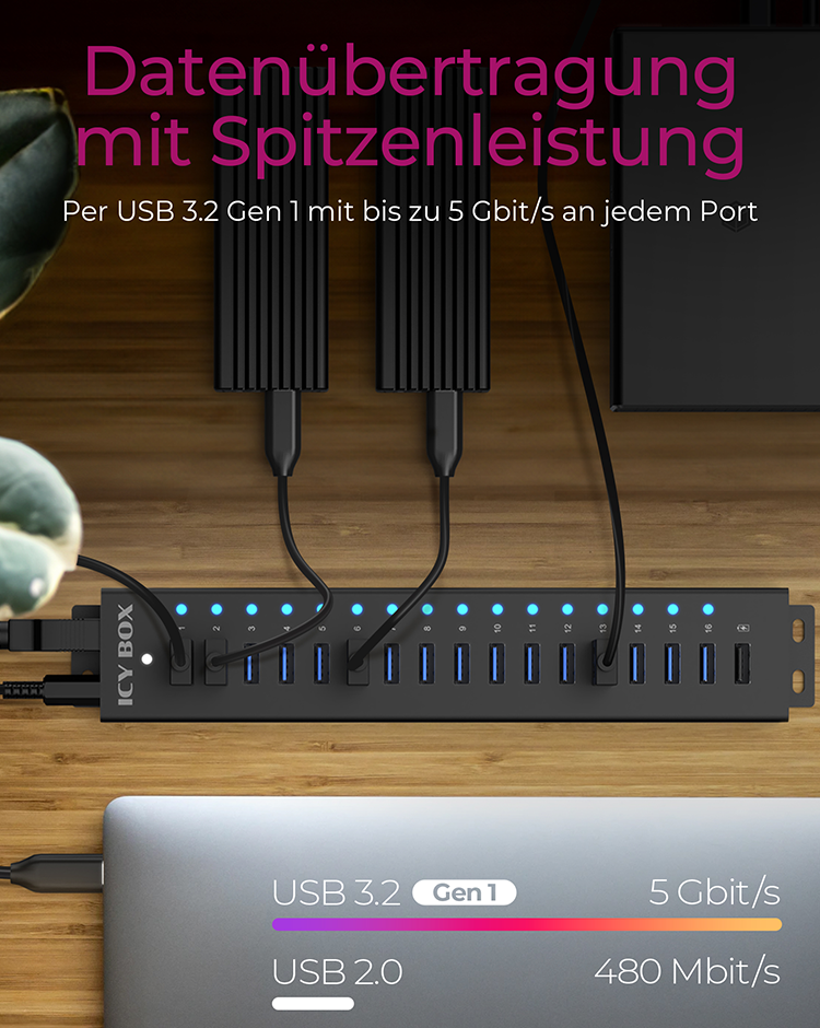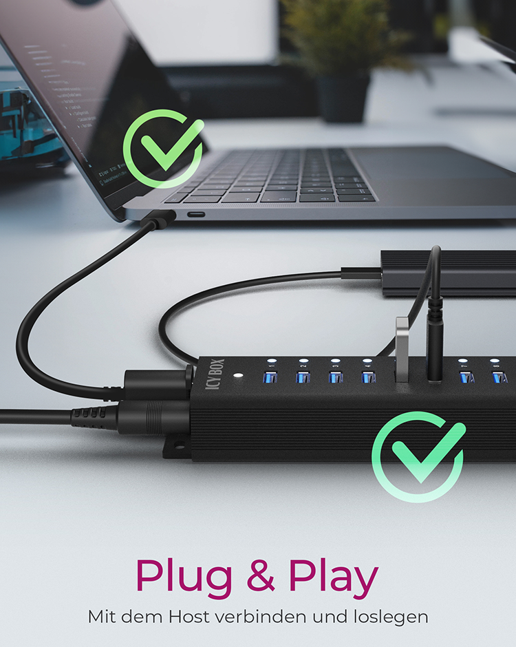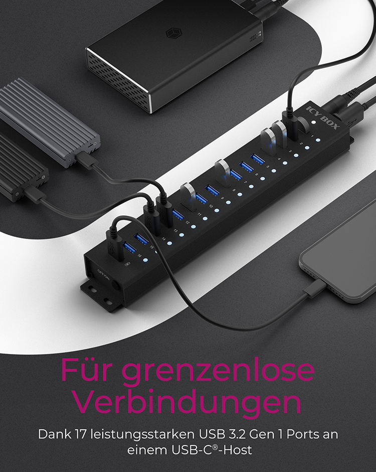 Die RaidSonic ICY BOX IB-HUB1717-U3 ist bekannt für ihre Fähigkeit, die Konnektivitätsoptionen zu erweitern. Dieser Hub verfügt über 17 USB 3.2 Gen 1-Anschlüsse, von denen jeder Datenübertragungsraten von bis zu 5 Gbit/s liefern kann, wodurch er sich für Hochgeschwindigkeits-Datenmanagement und das Aufladen von Geräten eignet. Er verfügt über ein robustes Aluminiumgehäuse und wird über ein externes 96-W-Netzteil mit Strom versorgt, so dass alle angeschlossenen Geräte ausreichend mit Strom versorgt und geschützt sind. Sein Desktop-Formfaktor, kombiniert mit Plug-and-Play- und UASP-Unterstützung, bietet eine nahtlose Integration in jedes Setup und steigert die Produktivität, ohne dass komplexe Installationen erforderlich sind. Ob für den professionellen oder privaten Gebrauch, der IB-HUB1717-U3 ist ein zuverlässiger Hub, der die Anforderungen moderner digitaler Umgebungen erfüllt.