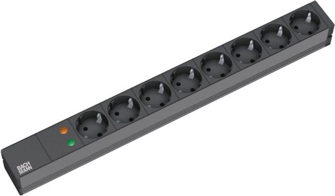 Bachmann 48,30cm (19")-Steckdosenleiste ÜSS, ALU, 8-fach, s schwarz, Schutzkontakt, 2 m, 1HE, ohne SchalterMit Überspannungsschutz 6,5 kA, optische Funktions- und Ausfallanzeige (333.534)