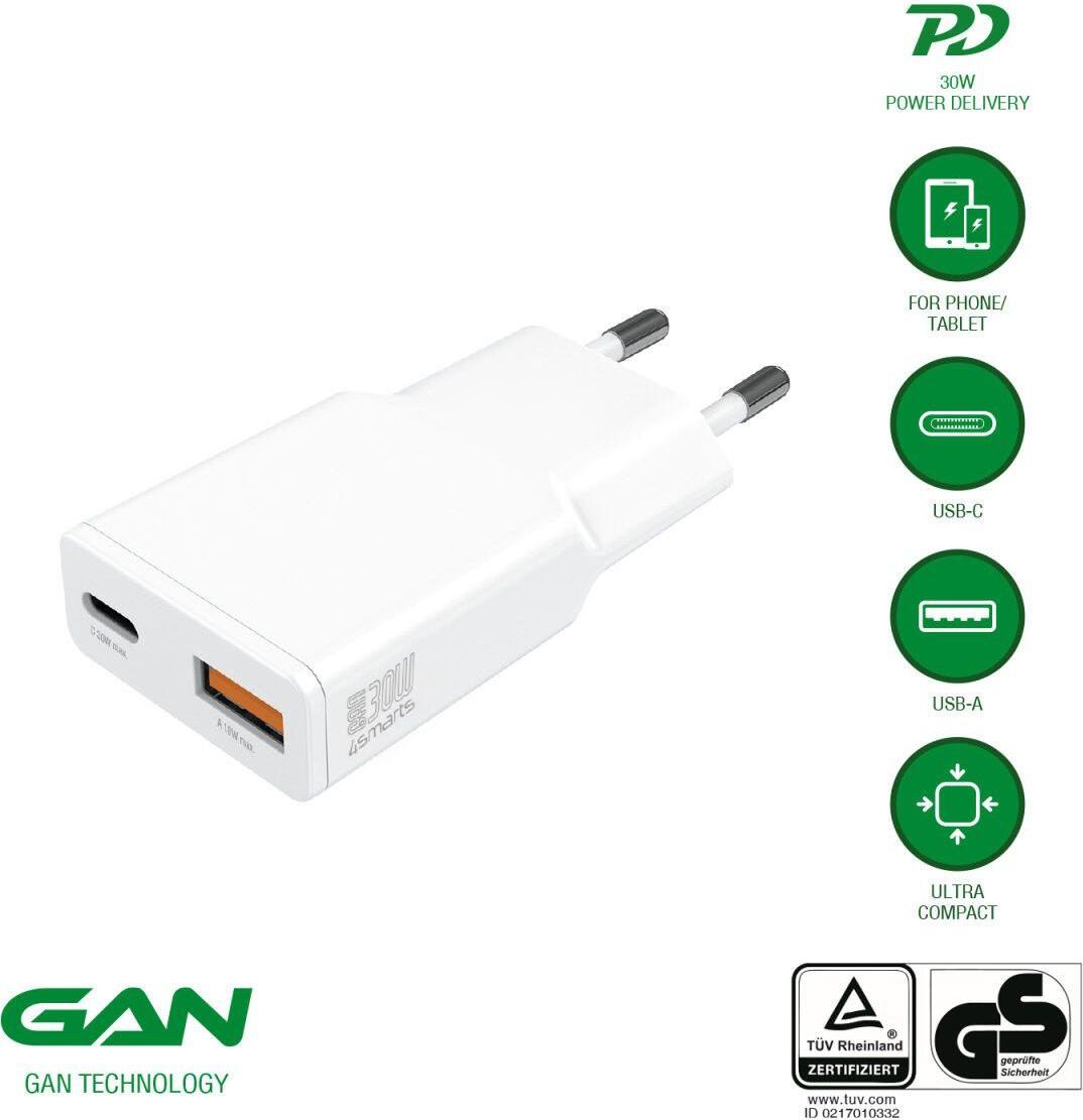 Das 4smarts-Netzteil ist eine effiziente Ladelösung für Tablets und Mobiltelefone. Dank GaN-Technologie bietet dieses Wandladegerät ein schlankes und kompaktes Design bei einer Ladeleistung von 30 Watt. Mit TÜV-Sicherheitszertifizierung gewährleistet es zuverlässige Leistung und Sicherheit während des Gebrauchs. Das Netzteil ist sowohl mit einem 4-poligen USB-Typ-A- als auch einem 24-poligen USB-C-Ausgang ausgestattet, sodass es für verschiedene Geräte geeignet ist und vielseitige Lademöglichkeiten bietet. Dank Schnellladetechnologie wie Qualcomm Quick Charge 2.0 und 3.0, Samsung Adaptive Fast Charging und Power Delivery 3.0 + PPS können Benutzer ihre Geräte schnell aufladen, was ihn zu einer praktischen Wahl für den Ladebedarf unterwegs macht.