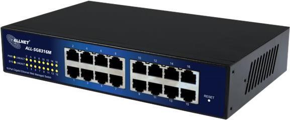 Der ALLNET ALL-SG8316M Switch stellt eine optimale Basis für kleine und mittlere Arbeitsgruppen mit hohem Netzwerk- und Datenaufkommen dar und ermöglicht eine schnelle Datenübertragung im Netzwerk.Mit insgesamt 16 abwärtskompatiblen Gigabit Ports sind die angebundenen Rechner und Serverzuverlässig und leistungsstark miteinander verbunden.Durch das lüfterlose Design ist der ALL-SG8316M auch ideal in Büroumgebung einsetzbar, da keinerlei störende Geräusche erzeugt werden. Der Switch ist smart managebar und unterstützt somit alle nötigen Standards wie QoS, VLAN, Storm-Control oder IGMP Snooping. Das sorgt für höchste Performance & Sicherheit in ihrem Netzwerk.Das robuste Gehäuse aus Metall ist sowohl für die Montage im 19\" Schrank, als auch zur Wandmontage geeignet.