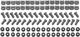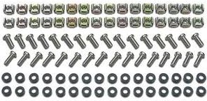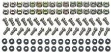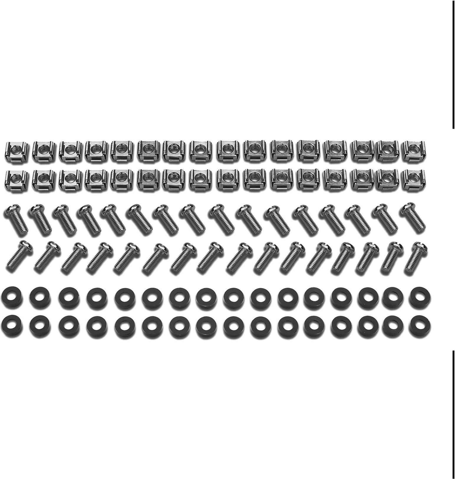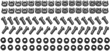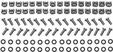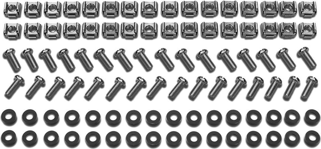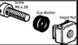 M6-Montagematerial für den Einbau von Geräten in Gehäusen mit Montageschienen mit quadratischen Öffnungen. Menge 32: M6-Käfigmuttern, Nylon-Unterlegscheiben und Schlitz-/Kreuzschlitzschrauben.