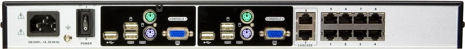 | Schnittstellen | 8 x LAN - RJ-45 2 x Kaskadierung - RJ-45 1 x RJ-11 - Management 2 x Tastatur (PS/2) 2 x Maus (PS/2) 2 x VGA - HD-15 4 x Tastatur (USB) / Maus (USB) - Type A 2 x USB - Type A |