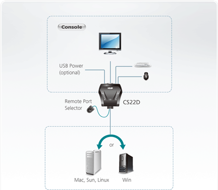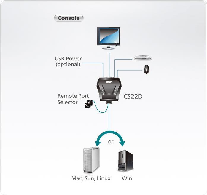 Entgegen andere KVM Switches der Marke ATEN benötigt dieses Modell auf der Rechnerseite lediglich einen USB-Port. Der Adapter fungiert also gleichzeitig als USB-Hub. Für extrem stromhungrige Geräte lässt sich eine 5V Stromversorgung über Mini-USB anschießen (Kabel liegt nicht bei).