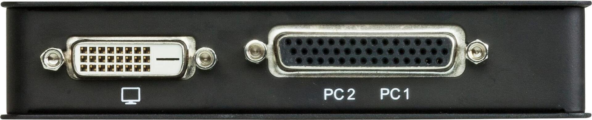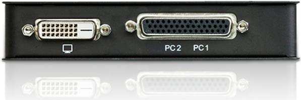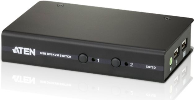 Der USB-KVM-Switch mit 2 Ports für DVI-Grafik CS72D ermöglicht die Steuerung von zwei Computern über eine einzige Konsole bestehend aus USB-Maus, USB-Tastatur und DVI-Monitor (Digital Visual Interface). Er unterstützt digitale Anzeigegeräte wie z.B. Flachbildschirme, Projektoren, Plasma- und digitale Fernseher. Der CS72D verwendet die Video DynaSyncT-Technologie von ATEN, die Anzeigeprobleme beim Einschalten verhindert und die Auflösung optimiert. Weiterhin unterstützt er viele hilfreiche Funktionen wie die automatische Erkennung eingeschalteter Geräte, 2.1-Kanal-Tonübertragung, den gemeinsamen Zugriff auf USB 2.0-Peripheriegeräte sowie schnelle und einfache Möglichkeiten, zwischen den angeschlossenen Computern umzuschalten.