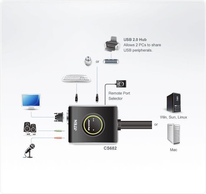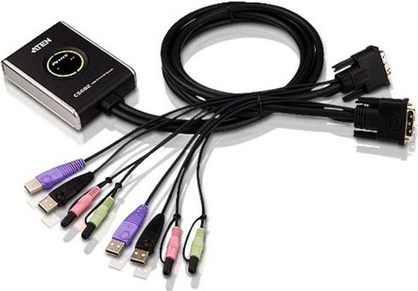 Der Umschalter erlaubt das Betreiben von zwei PC's an einem Bildschirm mit DVI-Anschluss, einer Tastatur und einer Maus mit USB-Anschluss. Der Ton wird per Cinch-Anschluesse uebertragen. Er funktioniert, wie bei mir auch mit einer Docking Station fuer den Laptop.