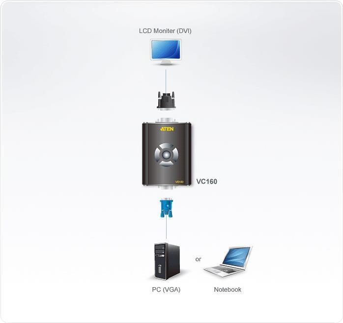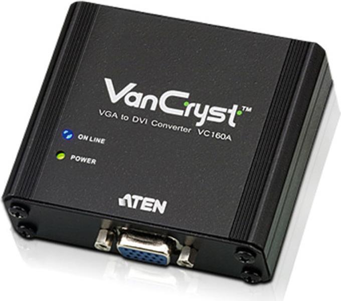 Der VC160A ist ein VGA-auf-DVI-Konverter, über den Sie das Bild Ihrer VGA-Signalquelle auf einem DVI-Bildschirm wiedergeben können. Er kann auf zwei Arten mit Strom versorgt werden: über den VGA-Port oder über ein Netzteil. Der VC160A ist kompakt, flexibel einsetzbar und einfach zu installieren - es ist keine Software erforderlich. Er unterstützt eine breite Palette Auflösungen, und macht so die Betrachtung hochqualitativer Bilder zum Vergnügen.