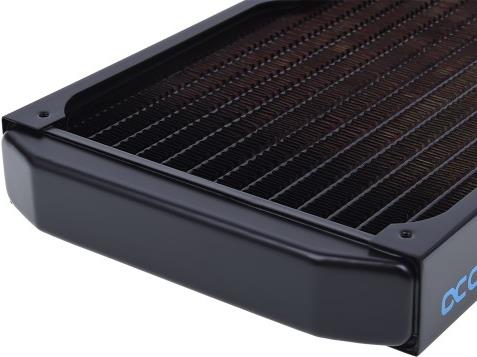 Alphacool ist seit Jahren in der Szene immer wieder ein Impulsgeber bei der Entwicklung und Verbesserung von Radiatoren. So sind diese Modelle mit die ersten Radiatoren, welche das Prädikat „Full Copper“ wirklich verdient haben! Alle Hauptelemente, nicht nur die Finnen und Kanäle, sondern auch die Vorkammern sind aus Kupfer. Dies bringt schon materialbedingt ein Leistungsplus, wo andere Radiatoren auf der Strecke bleiben. Der innere Aufbau ist konstruktiv auf Augenhöhe mit den Radiatoren anderer Hersteller und getrennte Vorkammern geben den Weg der Kühlflüssigkeit klar vor. Ein hoher Durchfluss erhöht die Kühlleistung im kompletten System. Eine flache Endkammer lässt auch bei der Montage mehr Freiraum, da die Gesamtlänge so geringer ausfällt.
