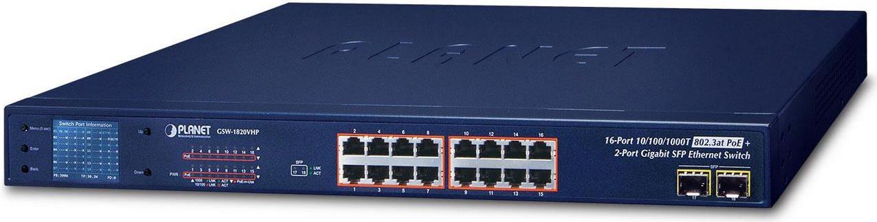 PLANET GSW-1820VHP - Switch - 16 x 10/100/1000 + 2 x Gigabit SFP - an Rack montierbar - PoE+ (300 W) (GSW-1820VHP)