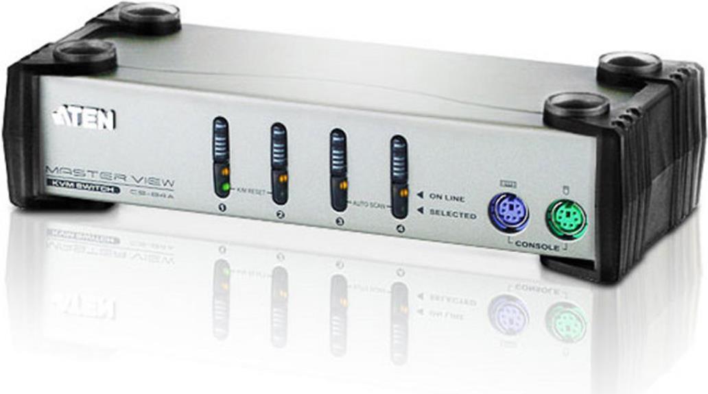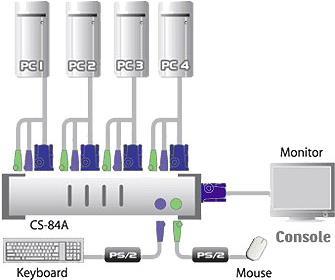 Technische Daten: Hersteller Aten Bezeichnung CS-84A Anschlüsse für 4 PCs PC Auswahl umschalten via HotKey Konsolenanschlüsse Tastatur: PS/2 Maus: ...