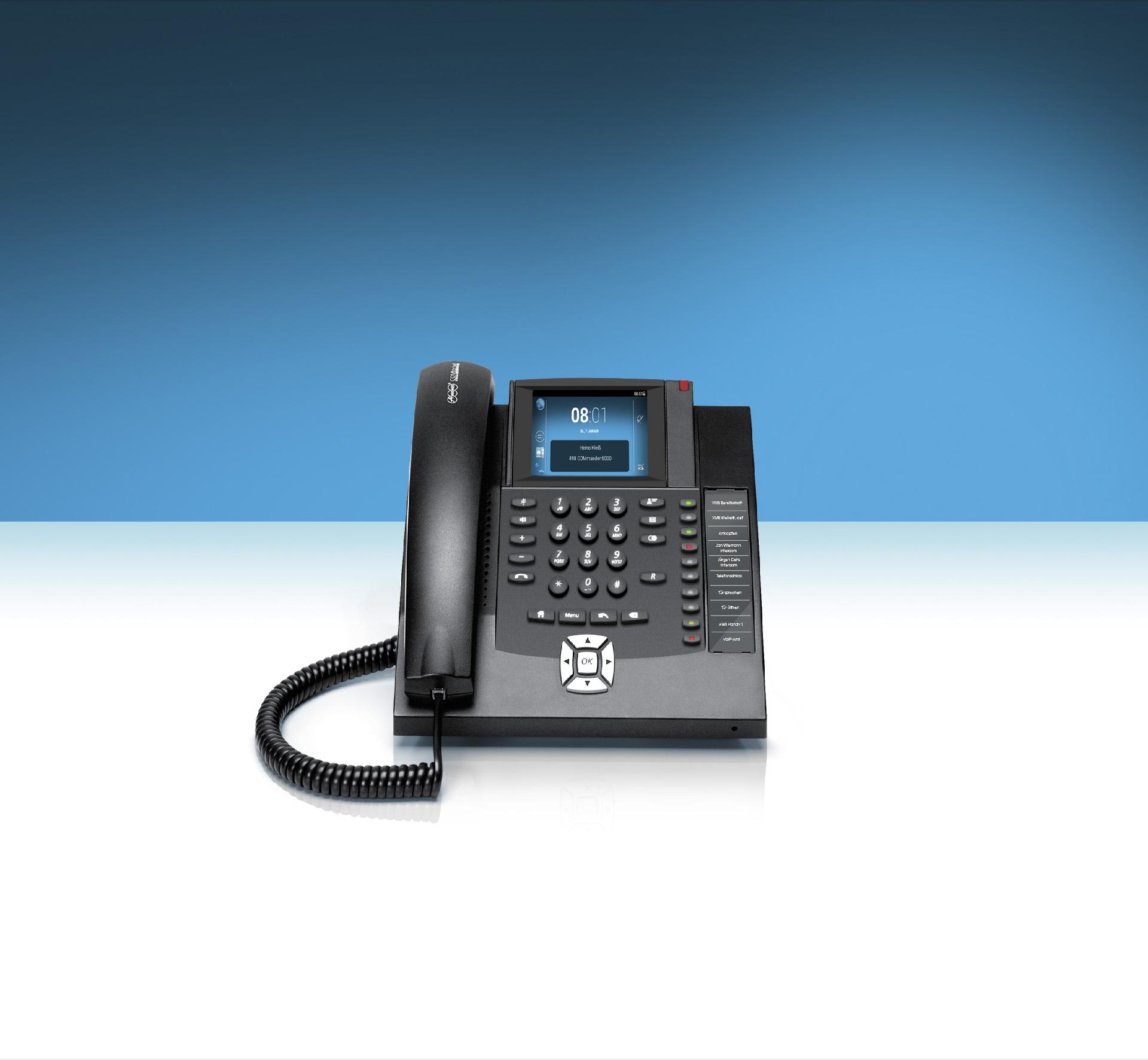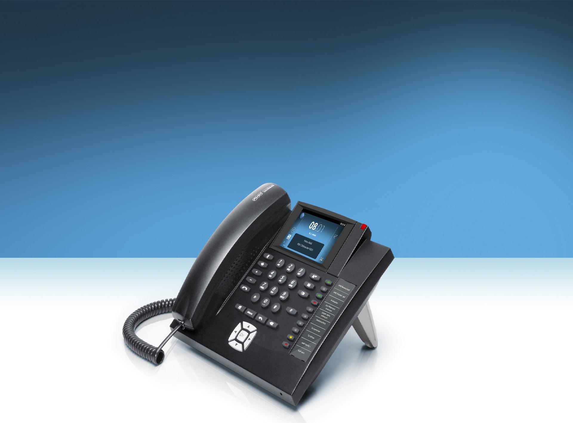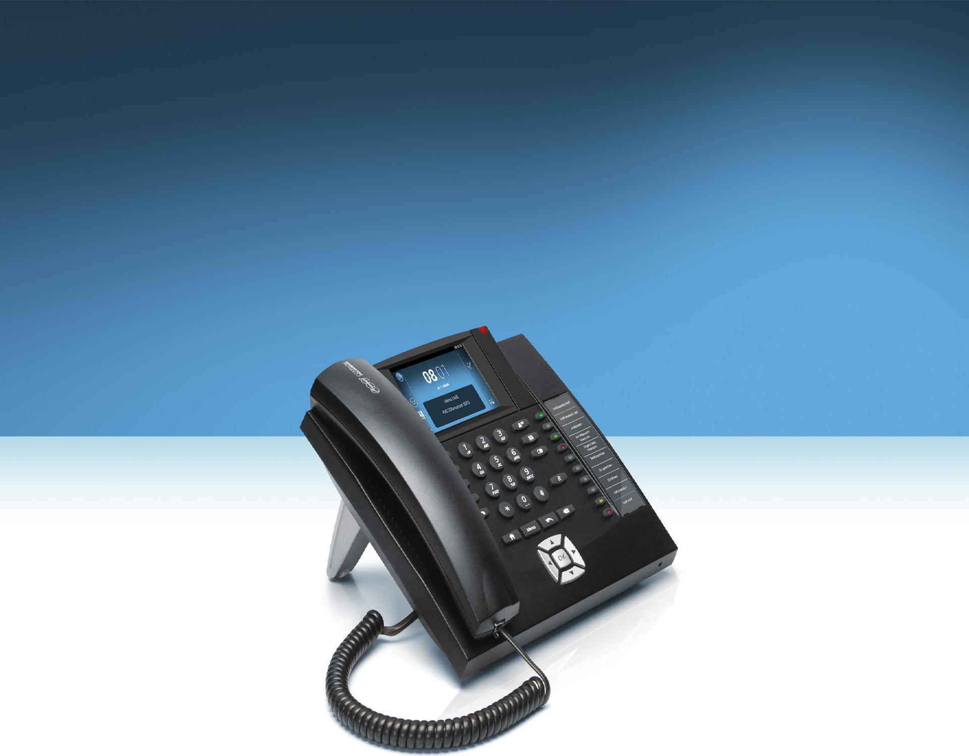 Das COMfortel 1400 IP zwingt Sie nicht zu einer Systementscheidung, denn es ist ein echtes hybrides VoIP-Telefon. Es ist sowohl als Systemtelefon an einer IP-TK-Anlage von Auerswald als auch als Standard-SIP-Telefon an einer Soft-PBX oder IP-Centrex-Lösung verschiedener Hersteller und Provider einsetzbar. Egal für welche Lösung Sie sich entscheiden, das COMfortel 1400 IP passt einfach immer dazu. Das COMfortel 1400 IP lässt sich über Tasten und Steuerkreuz, aber auch wie ein Smartphone über die Touchfunktion des 3,5 Zoll großen Displays bedienen. Das COMfortel 1400 IP verfügt über zehn programmierbare Tasten mit eingebauten Status-LEDs, auf die Anlagen-, Zielwahl- und SIP-Funktionen gelegt werden können. Nach optionaler Funktionsfreischaltung über das Auerswald Upgrade-Center lassen sich E-Mails sowie Kalender- und Kontaktdaten einfach via Push-Dienst von Ihrem Google -Account, aus der TelekomCloud, der Apple iCloud oder von einem Microsoft Exchange-Konto synchronisieren. Auch der integrierte Anrufbeantworter und die Unterstützung für IP-Kameras sind einfach zum kleinen Tarif freizuschalten. Für den Anschluss von Standard-Headsets bietet das COMfortel 1400 IP eine separate Schnittstelle. Eine oben in der Displayhaube integrierte LED signalisiert Anrufe und Nachrichten in der Voicemailbox. Sogar die Möglichkeit zur Wandmontage hat dieses vielseitig begabte Telefon: Einfach die Gehäusefüße, mit denen bei Aufstellung als Tischgerät die Neigung verstellt wird, entfernen, und schon kann das COMfortel 1400 IP senkrecht montiert werden.