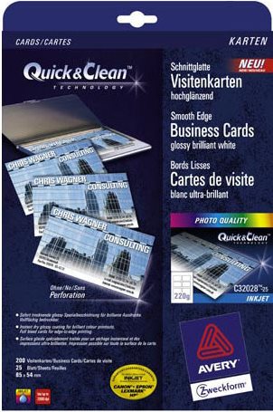 Wie oft warten Sie und Ihre Kollegen auf fertig gedruckte Visitenkarten aus der Druckerei? Diese Wartezeiten können Sie nun vermeiden. Erstellen Sie professionelle Visitenkarten mit glatten Kanten innerhalb weniger Minuten selbst. So erhalten Sie professionelle Visitenkarten mit glatten Kanten wie aus der Druckerei! Die Avery Zweckform Visitenkarten mit glatten Kanten für Farblaser Drucker gibt es auch in 270 g/qm (220 g/qm) Qualität. Und das Beste zum Schluss: Beeindrucken Sie doppelt und nutzen Sie die Rückseite Ihrer Visitenkarten für weitere Informationen wie z.B. Öffnungszeiten, Wegbeschreibung u.v.m.