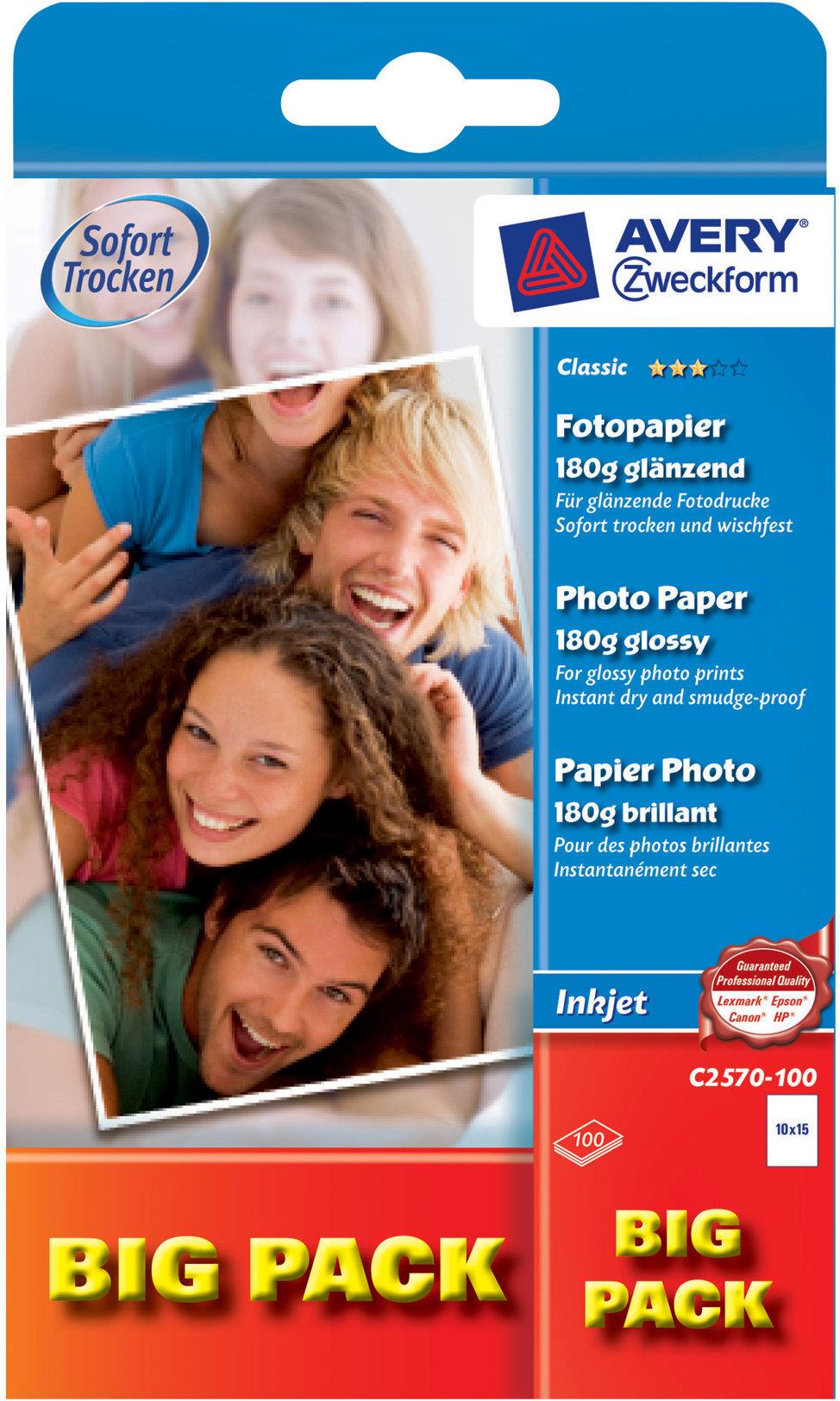 Avery Zweckform Classic Inkjet Photo Paper C2570 - Glänzend - weiß - 100 x 150 mm - 180 g/m² - 100 Blatt Fotopapier (C2570-100)
