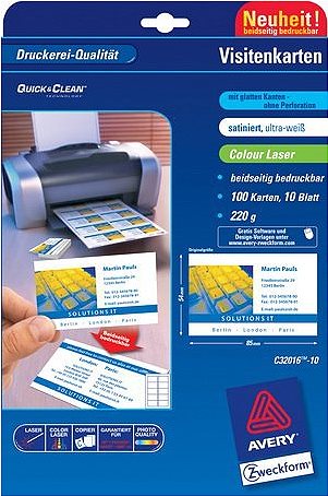 Gestalten und drucken Sie Ihre Visitenkarten selbst und vermeiden Sie Wartezeiten bei externen Druckereien! Die Premium Visitenkarten von Avery Zweckform garantieren exzellente Druckqualität durch die satinierte und ultraweiße Oberfläche speziell für Laser-Drucker. Die beidseitig bedruckbare Visitenkarte, mit einer Grammatur von 220 g/m², hat dank patentierter Quick&Clean Technologie absolut glatte Kanten. Auf der Rückseite finden zusätzliche Informationen wie Öffnungszeiten, Anfahrtsskizze oder Serviceleistungen Platz. Mit der Avery Zweckform Software Design & Print Online erstellen und drucken Sie Ihre Visitenkarten schnell und einfach am eigenen PC!
