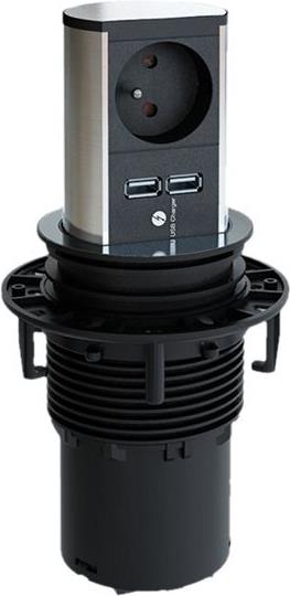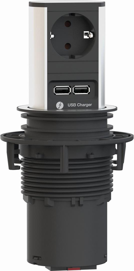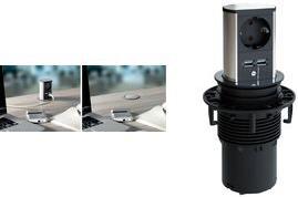Per Daumendruck fährt ELEVATOR aus und wird so auch wieder versenkt. ELEVATOR gibt es in zwei Ausführungen: mit drei Steckdosen oder mit einer Steckdose und zwei Datenschlüssen.