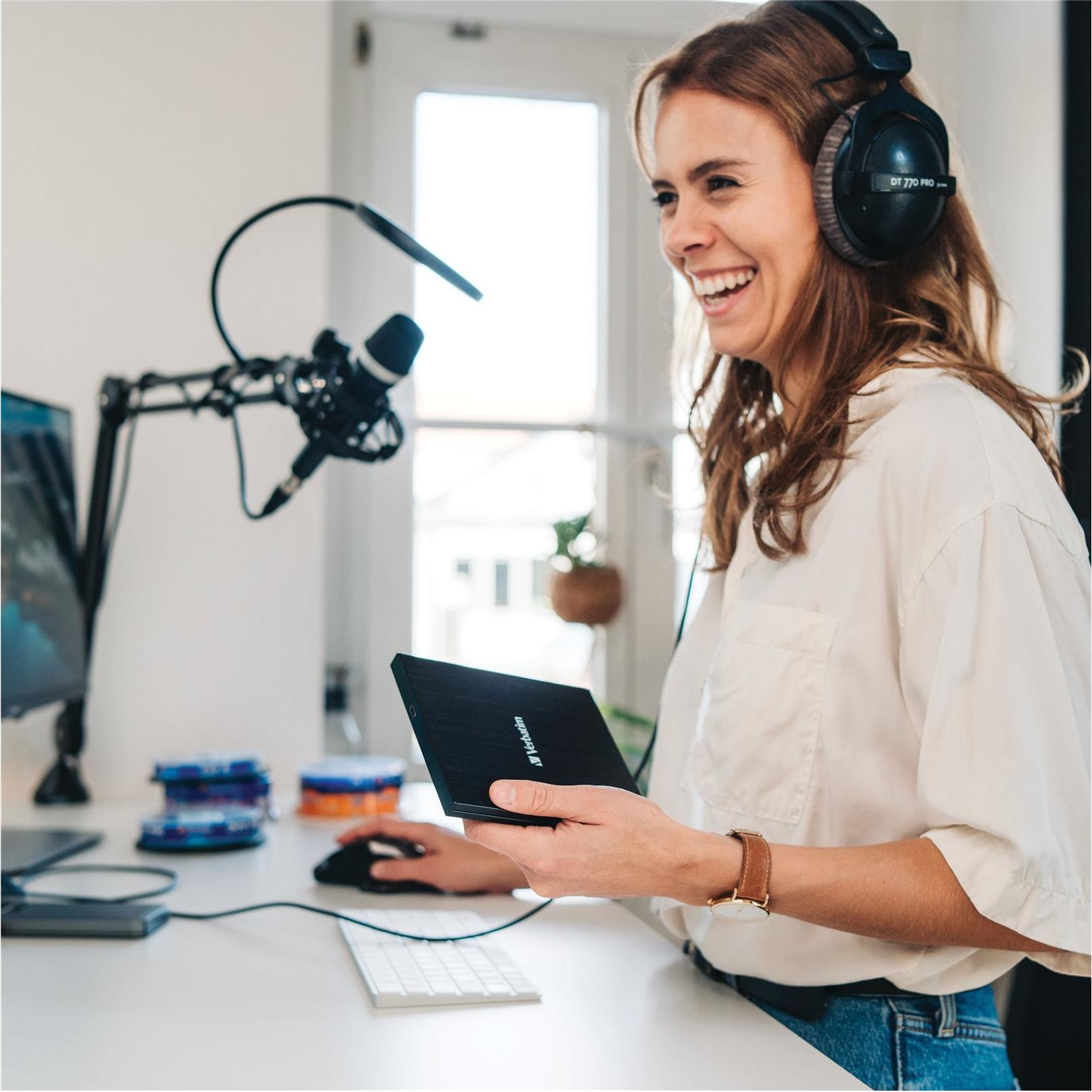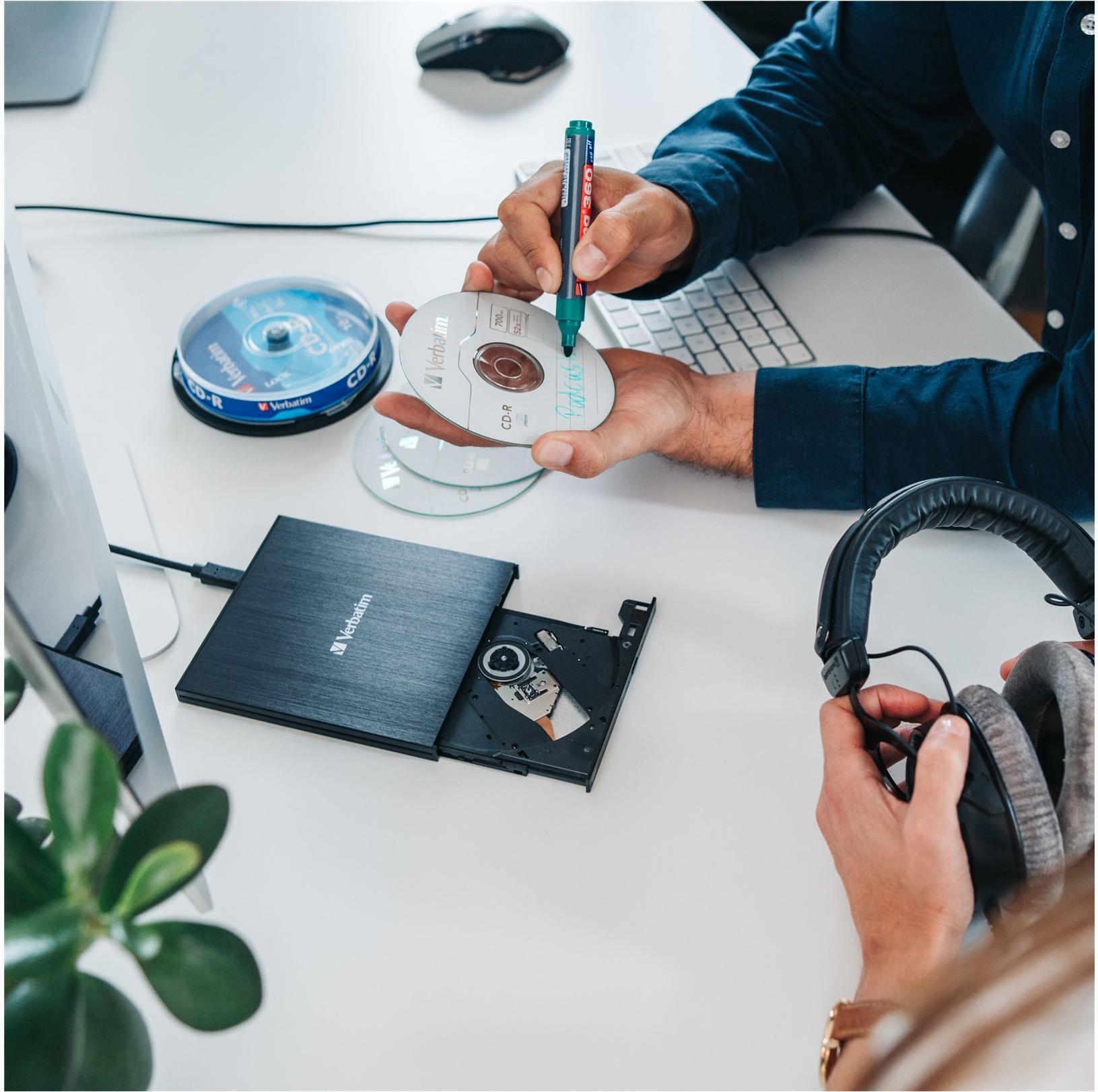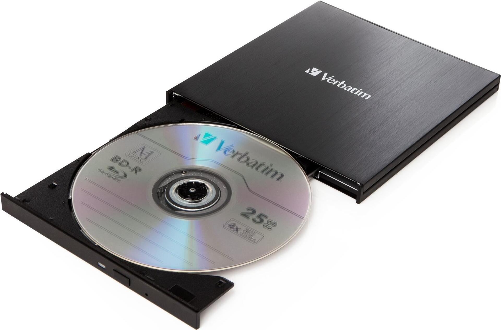 Blu-ray Discs werden immer mehr zur besten Speicherlösung bei der Archivierung wertvoller Daten: Im Vergleich zu Festplatten oder Magnetbändern bieten sie ein \"zukunftssicheres\" Format, große Kompatibilität, viel Speicherplatz und extrem hohe Lebensdauer. Leider verbannen immer mehr Notebook-Hersteller die optischen Laufwerke aus ihren Geräten, um diese noch dünner zu machen. Verbatim bietet mit diesem externen Slimline Blu-ray-Brenner die Lösung.Dieses kleine Gerät ist genau das, was Sie als Besitzer eines Notebooks, Ultrabooks, Netbooks oder eines anderen Gerätes brauchen, das keinen Blu-ray-Brenner hat. Damit können Sie Backups aller wichtigen Dateien erstellen, die Sie nie verlieren wollen, zum Beispiel Familienbilder, Videos, Bilanzunterlagen etc.Die Stromversorgung des externen Slimline Blu-ray-Brenners von Verbatim erfolgt über USB, Sie brauchen also keinen sperrigen Adapter. Das Laufwerk ist nur unwesentlich größer als eine Blu-ray Disc, kann also leicht transportiert werden und ist somit immer dabei!