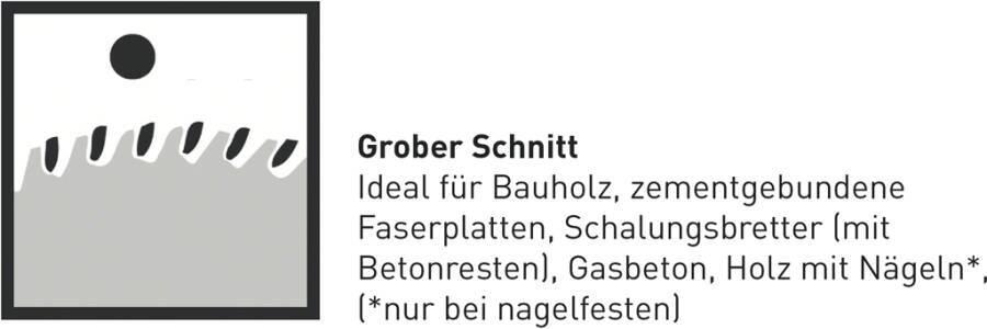 Produkttext[/head]Das spezielle Zahndesign und die breite Abstützung im Zahnrücken sorgen für eine hohe Widerstandskraft und schneiden Baustellenholz mit Fremdkörpern wie Nägel und Betonreste.[head]Hauptmerkmale