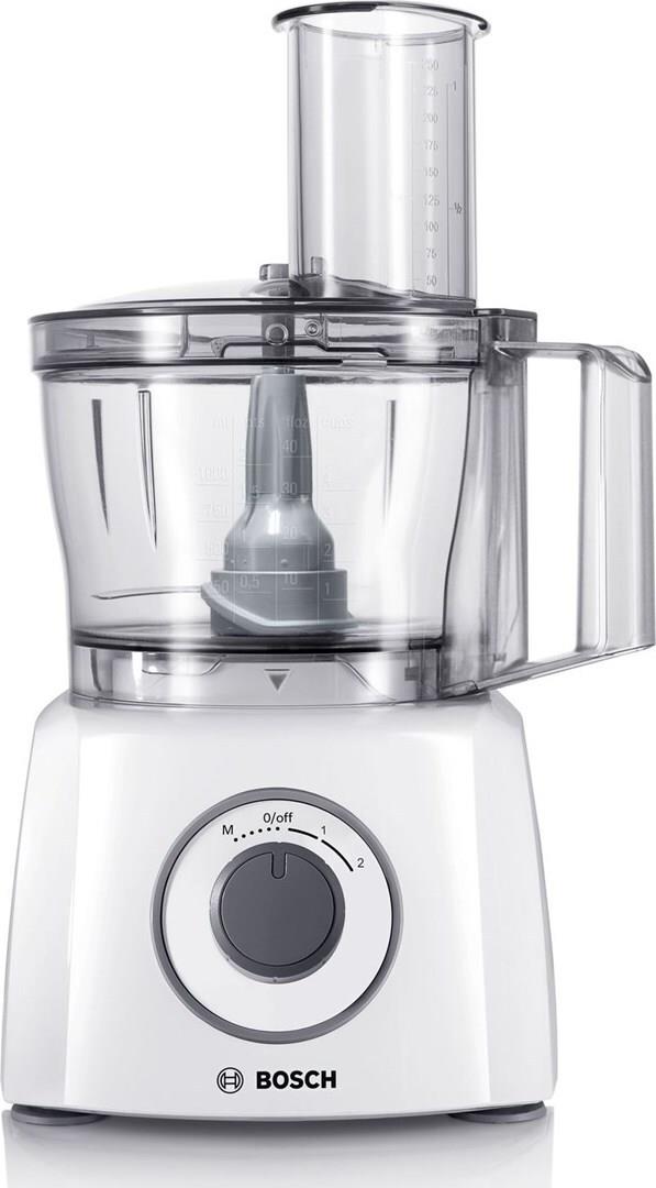 Rührbesen, umdrehbare Schneidscheibe (rauh und fein), doppelseitige Schneidscheibe (dick und dünn), 6-fach-Klinge, Schüssel (2,3 l), Mixbehälter Aufsatz (1 l) |