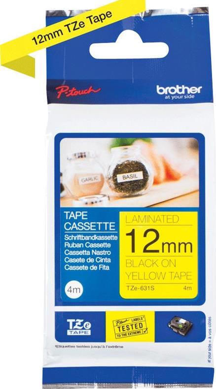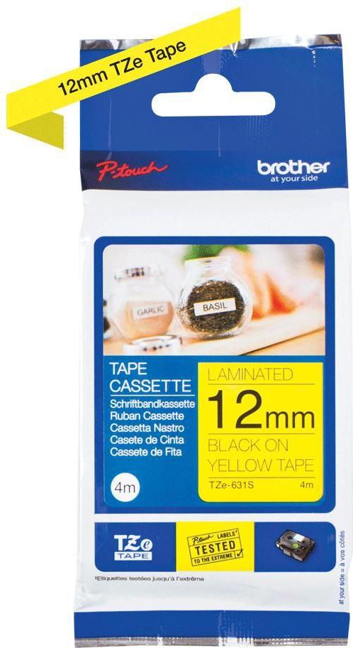 Das Original Brother TZe-631S Schriftband mit schwarzer Schrift auf gelbem Hintergrund ist perfekt lesbar und vielseitig einsetzbar – ganz gleich, ob zu Hause, im Büro oder an anderen Arbeitsplätzen. Dank seiner Laminierung ist das Schriftband wisch-, wetter- und kratzfest und hält selbst extremen Bedingungen hinsichtlich Abrieb, Temperaturen, Chemikalien und UV-Licht stand. Mit der Original Brother TZe-631S Schriftbandkassette drucken Sie klare, gestochen scharfe und perfekt lesbare Etiketten. Dank der Laminierung durch den patentierten Hinterbanddruck halten die selbstklebenden Etiketten nicht nur extremen Temperaturen stand, sondern sind zudem UV-beständig, wasserfest und vor Abrieb und Chemikalien geschützt. Dadurch sind sie sowohl für den Innen- und Außenbereich als auch für die Industrie geeignet. Das laminierte TZe-631S Schriftband mit schwarzer Schrift auf gelbem Hintergrund ist optimal zu Hause, im Büro oder an anderen Arbeitsplätzen einsetzbar. Mit ihm können Sie Ordner, Briefkästen, Regale, Kabel, USB-Sticks und vieles mehr beschriften. TZe-Schriftbandkassetten sind schnell und einfach zu installieren und in verschiedenen Breiten, Farben und Materialien erhältlich. So können Sie mit Ihrem P-touch Gerät sämtliche Beschriftungsaufträge erfüllen.