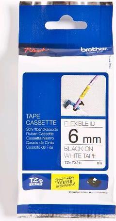 Für P-touch entwickeltes, 6 mm breites, schwarz auf weiß laminiertes und 8 m langes Flexi-Tape.