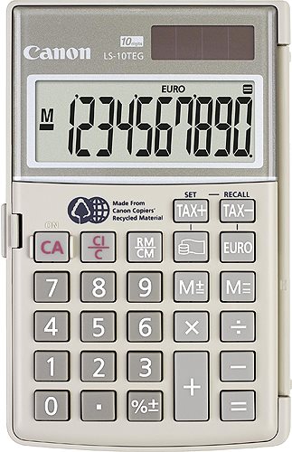 Der Rechner für Unternehmen und alle, die den Umweltschutz ernst nehmen: Hergestellt aus Recycling-Material von Canon Kopierern bietet dieser Taschenrechner ein Display mit 10 Stellen sowie Steuerberechnungs- und Euro-Funktionen.