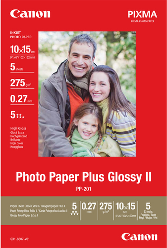 Canon Photo Paper Plus II PP-201 - Fotopapier, hochglänzend - 270 Mikron - 100 x 150 mm - 260 g/m2 - 5 Blatt - für PIXMA iP2600, iP2700, iP3500, iP4500, iX7000, MG8250, MP220, MP520, MX700, MX7600, MX850 (2311B053)