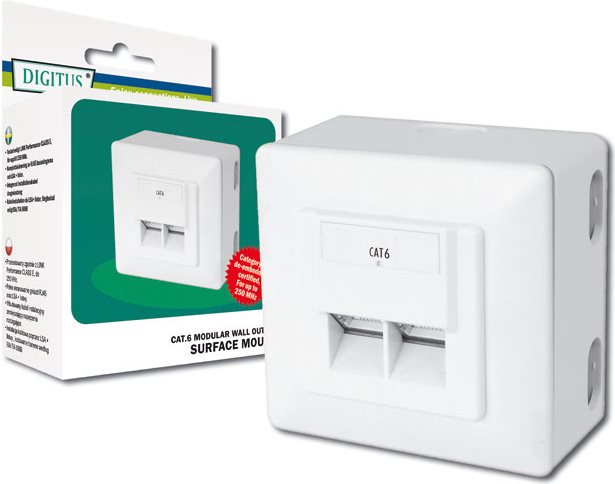 Die geschirmten CAT 6 Datenanschlussdosen von DIGITUS® sind zertifiziert nach CAT 6 EIA/TIA 568 und ISO/IEC 11801, EN 50173. Kabelinstallation erfolgt über LSA-Leisten, farbcodiert nach EIA/TIA 568 B bei horizontaler Kabeleinführung. Alle Datenanschlussdosen von DIGITUS® sind erhältlich als Unterputz-oder Aufputzversion.