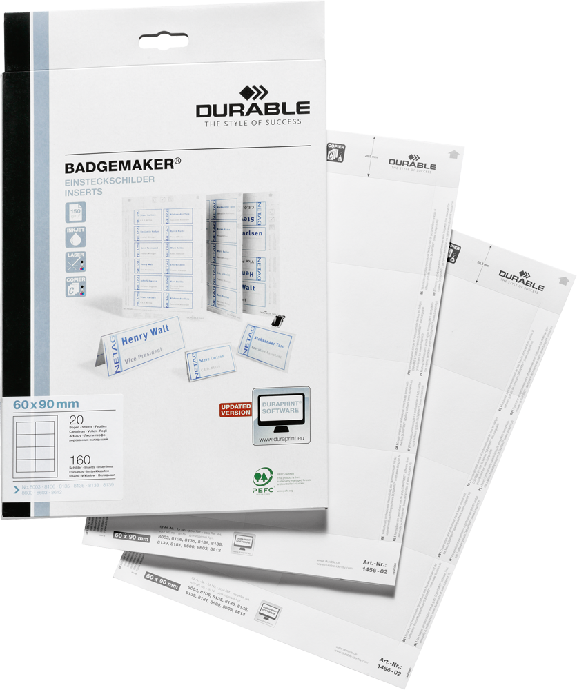 Für Namensschilder im Format 60x90 mm. Mit Laser-, Inkjet-, Matrixdrucker oder Kopierer bedruckbar. Auf A4-Blättern, mikroperforiert. Aus 160 g/qm Karton. Exakt abgestimmt auf die Beschriftungssoftware DURAPRINT Software.