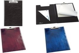 Tasche im Rückendeckel zur Arretierung des Blockrückens, große Dreiecktasche im Vorderdeckel. Aus Weichfolie mit Kartonverstärkung.