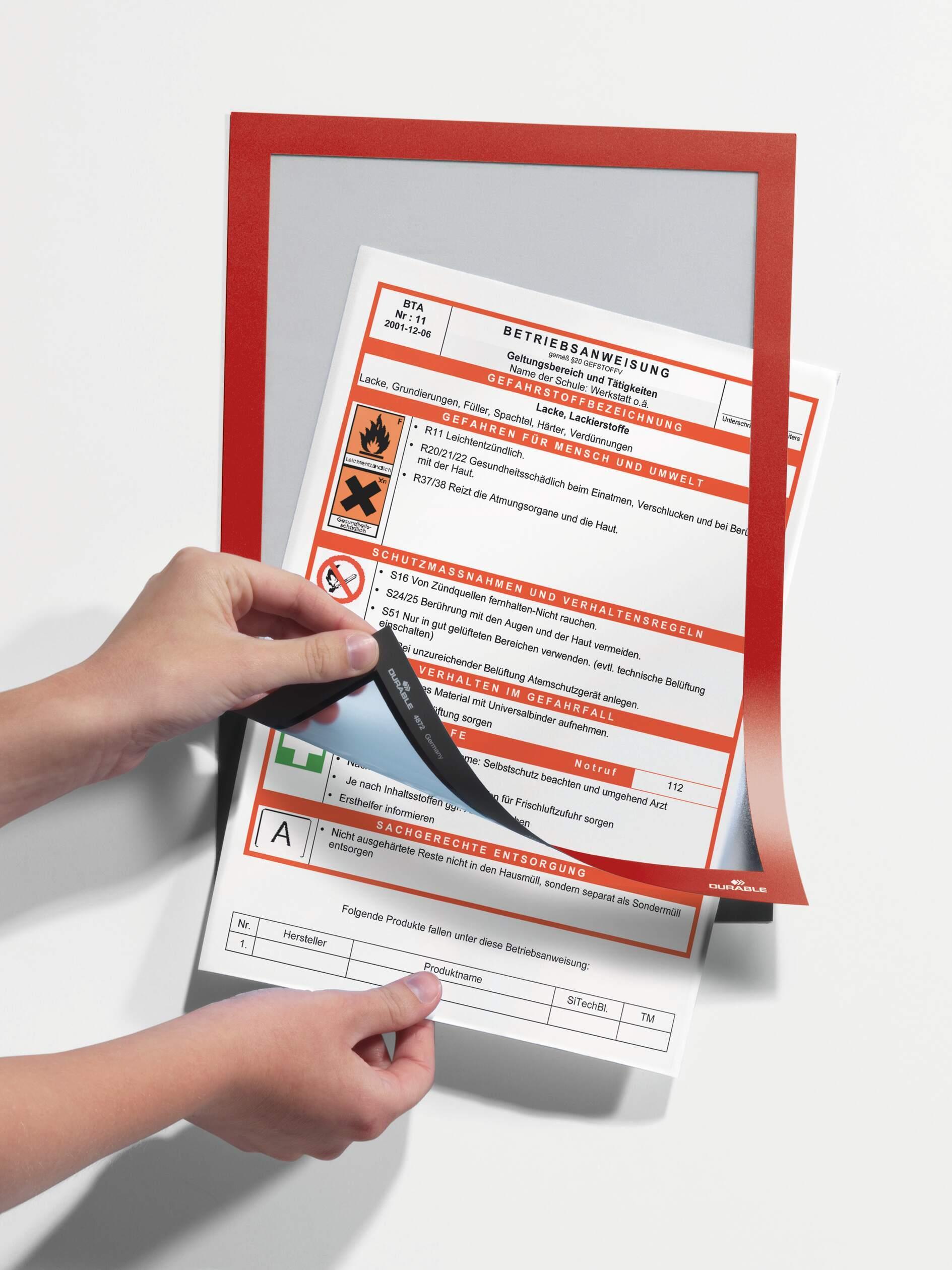 Selbstklebender Informationsrahmen im Format DIN A4 mit aufklappbarer, magnetischer Vorderseite für schnelles und bequemes Wechseln von Informationen. Haftet auf allen glatten Oberflächen und kann entfernt und neu angeklebt werden.