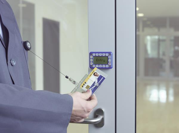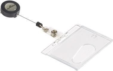 Die Hartbox (wie Art. 8005) schützt Betriebsausweise und schafft gleichzeitig durch die Daumenstanzung einen schnellen Zugriff. Mit Ausweishalter Art. 8152 (ca. 80cm ausziehbar).