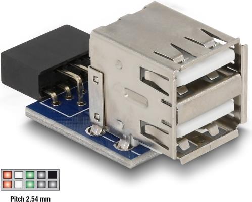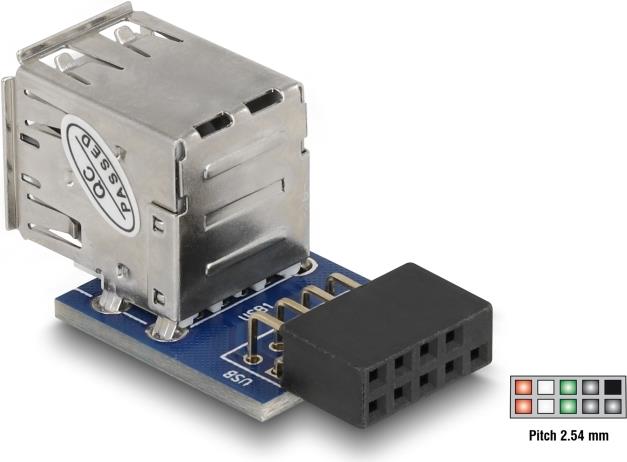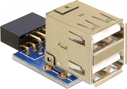 Diesen USB Pin Header können Sie auf einen freien USB Pin Header Stecker Ihres Mainboards stecken, um Ihr System intern um 2 USB-A Ports zu erweitern. Somit können Sie intern z.B. einen USB Memory Stick oder USBWLAN Stick verwenden. Ausgehend vom Mainboard, sind beide USB Buchsen nach oben ausgerichtet und übereinander angeordnet.