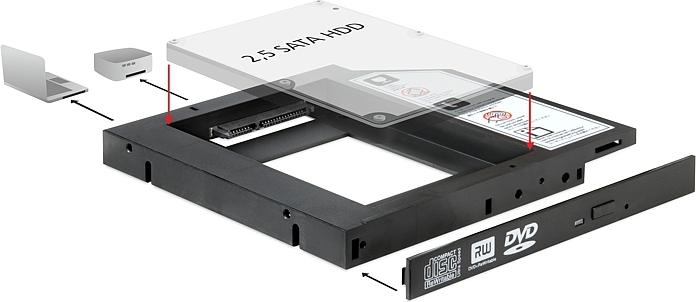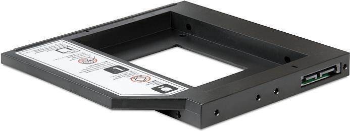 Diesen Delock Einbaurahmen im Slim-Format können Sie in einen 5.25 SATA Slim Slot einbauen und darin eine 2.5 SATA Festplatte betreiben. Im Lieferumfang befindet sich eine universelle Frontblende, die Sie zum Beispiel beim Einbau in einen Mini PC nutzen können, bzw. wenn die vorhandene Blende Ihres Notebooks nicht passt.