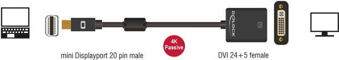 Mit diesem Adapter von Delock können Sie z. B. einen DVI Monitor über eine freie mini Displayport Schnittstelle Ihres Systems anschließen. Der Adapter unterstützt eine Auflösung bis Ultra HD (4K) und ist abwärtskompatibel zu Full-HD 1080p. Der Adapter bietet eine aktive Konvertierung, somit ist er auch für Grafikkarten geeignet, die keine DP++ Signale ausgeben können.