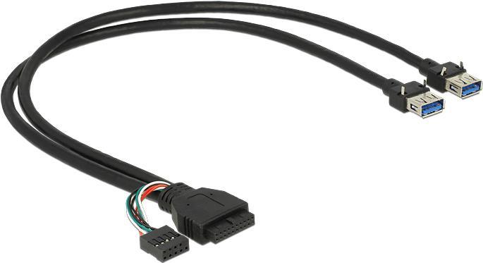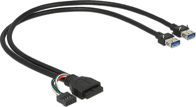 Dieses USB Y-Kabel von Delock dient zum internen Anschluss an einen freien USB 3.0 oder USB 2.0 Pfostenstecker auf einem Mainboard. Es erweitert das System um zwei USB 3.0 A Buchsen. Somit können die angeschlossenen Geräte entweder mit USB 3.0 oder USB 2.0 Geschwindigkeit betrieben werden. Das Kabel eignet sich besonders für selbstkonstruierte Computersysteme.