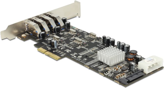 Die Delock PCI Express Karte erweitert Ihren PC um vier externe USB 3.0 Ports. Jeder Port wird von einem einzelnen NEC Chipsatz versorgt, wodurch eine hohe Datentransferrate ermöglicht wird. Sie können an die Karte verschiedene USB Geräte, wie z. B. Docking Stationen, Card Reader, externe Gehäuse etc. anschließen. Aufgrund der vertikalen Anordnung der USB 3.0 Ports, ist ein Einbau in einem Low Profile Slot möglich.
