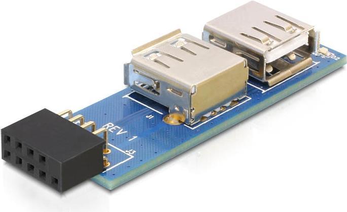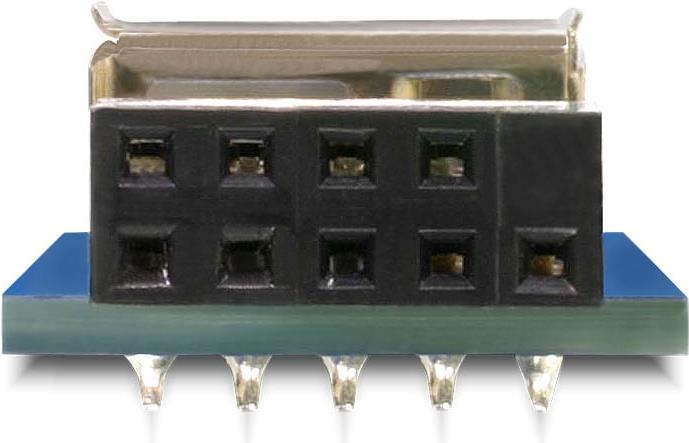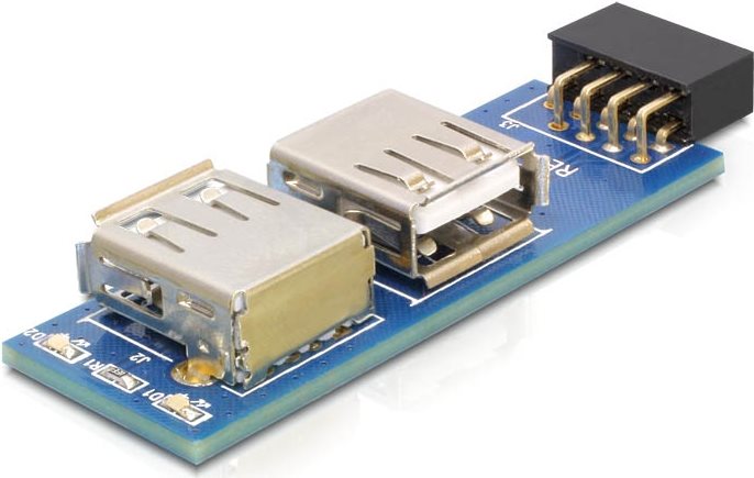 Diesen USB Pin Header können Sie auf einen freien USB Pin Header Stecker Ihres Mainboards stecken, um Ihr System intern um 2 USB-A Ports zu erweitern. Somit können Sie intern z.B. einen USB Memory Stick oder USB-WLAN Stick verwenden. Ausgehend vom Mainboard, sind beide USB Buchsen nach rechts und links ausgerichtet.