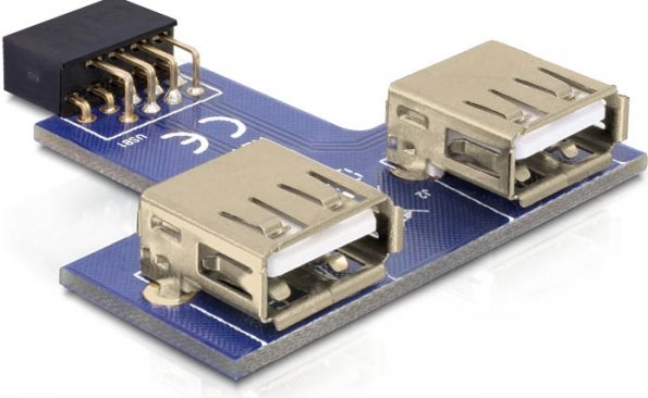 Diesen USB Pin Header können Sie auf einen freien USB Pin Header Stecker Ihres Mainboards stecken, um Ihr System intern um 2 USB-A Ports zu erweitern. Somit können Sie intern z.B. einen USB Memory Stick oder USBWLAN Stick verwenden. Ausgehend vom Mainboard, sind beide USB Buchsen nach oben ausgerichtet und nebeneinander angeordnet.