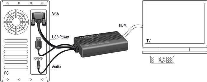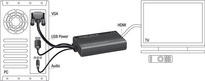 Dieser VGA zu HDMI Adapter von Delock dient zum Anschluss eines HDMI Displays an Ihrem PC bzw. Notebook. Durch die Verwendung des Klinkenkabels an Ihrem PC bzw. Notebook, können Sie über diesen Adapter auch das Audiosignal übertragen. Des Weiteren wird der Adapter über den USB Anschluss mit Strom versorgt und benötigt somit kein zusätzliches Netzteil.