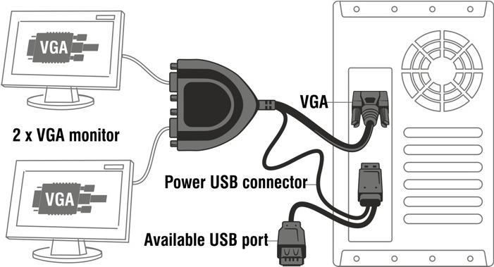 Dieser Delock VGA Data Splitter dient zur Aufteilung eines Videosignals vom Videoausgang Ihres PCs oder Notebooks. Dadurch können Sie an einem VGA Anschluss zwei Monitore verwenden. Die Stromzufuhr erfolgt über die USB Schnittstelle, wobei durch die USB Stecker und Buchse Lösung kein Anschluss besetzt wird.