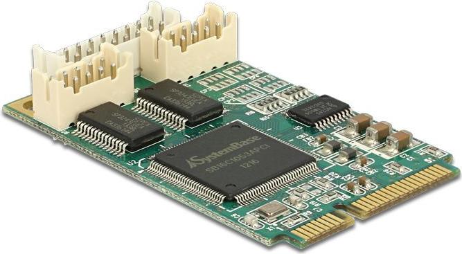Dieser MiniPCIe-Adapter von Delock erweitert Ihr System um zwei zusätzliche serielle und eine parallele Schnittstelle, die Sie über das Slotblech herausführen können. Sie können verschiedene serielle und parallele Geräte wie Drucker, Scanner, Modem etc. an diesen Adapter anschließen.