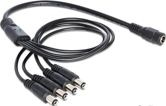 Dieses Delock Verteilerkabel dient zum Anschluss von vier Geräten, welche Kleinspannung benötigen, wie z.B. Kameras oder LED-Streifen an ein Netzteil mit DC Anschluss.