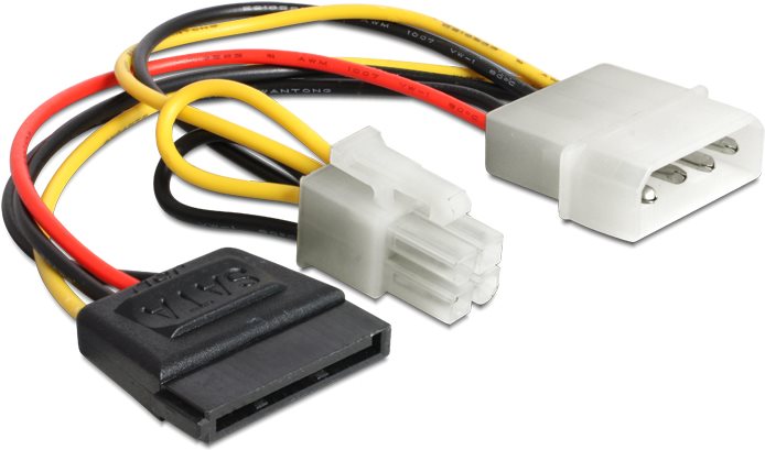 Dieses Stromkabel von Delock können Sie an einen freien Molex Anschluss Ihres Netzteils stecken und diverse Geräte mit SATA Stromanschluss und P4 Anschluss mit Strom versorgen.