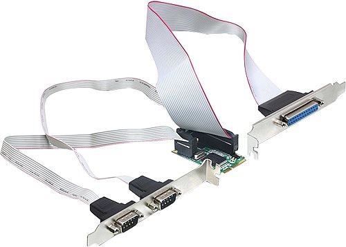 | Verbindungen | Am Kabel : 1 x Parallel DB25 Buchse mit Muttern, 2 x Seriell RS-232 DB9 Stecker mit Muttern Auf Platine : 2 x 9 Pin COM Port Pin Header, 1 x 25 Pin Parallel Port Pin Header |