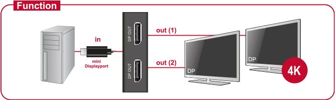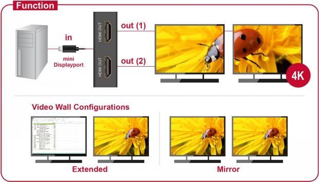 Dieser Splitter von Delock erhält ein Displayport Signal von einem PC oder Notebook und teilt es auf zwei angeschlossene Bildschirme auf. Somit können an einem mini Displayport Anschluss zwei Displayport Monitore betrieben werden. Beide Ausgänge sind Dual Mode fähig (DP++), so können alternativ auch HDMI oder DVI Monitore mit entsprechenden Adaptern angeschlossen werden.