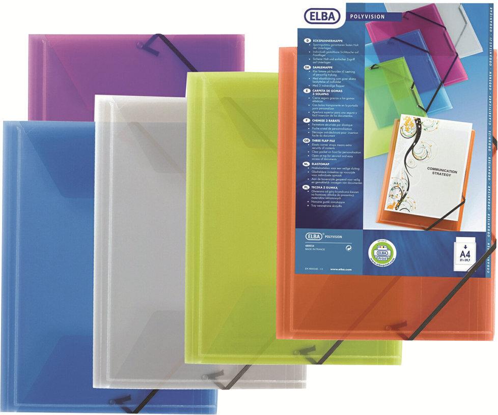 ELBA Eckspannermappe image+, farbig sortiert mit DIN A4-Sichttasche, für ca. 50 Blatt (80 g/qm), sortiert in den Farben: transparent-blau, -grün, -rot und farblos gepackt zu 12 Stück (M48003420 / 100201150)