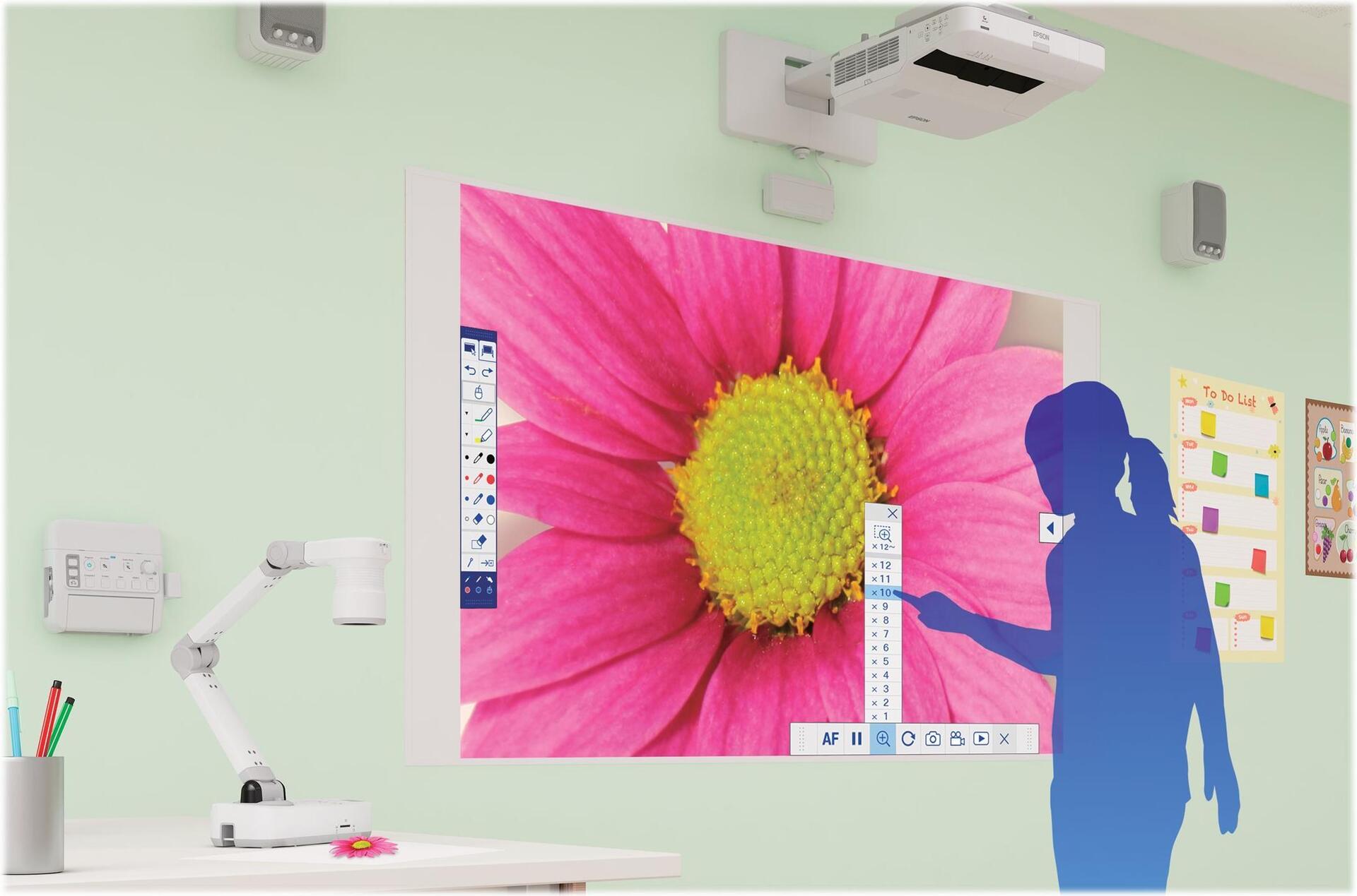 Der Ultrakurzdistanz-Projektor EB-695Wi projiziert große Bilder aus kürzester Distanz, ohne Schatten oder Blendeffekte – mit einer Weiß- und Farbhelligkeit von 3.500 Lumen und HD-Ready-WXGA-Auflösung. Dieser Projektor bietet ultimative Interaktivität durch Fingertouch-Funktion und zwei Stifte. Ein Kontrastverhältnis von 14.000:1 und ein HDMI-Eingang sorgen für gestochen scharfe und klare Bilder.