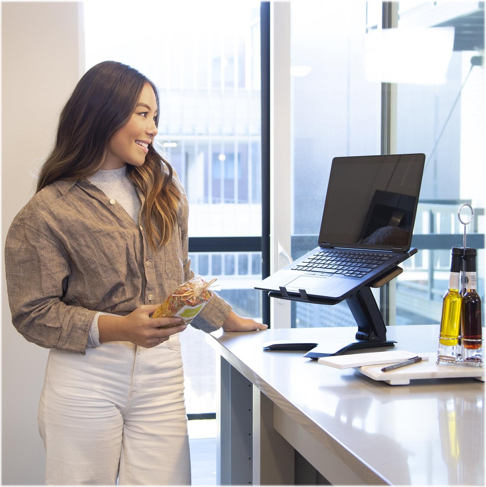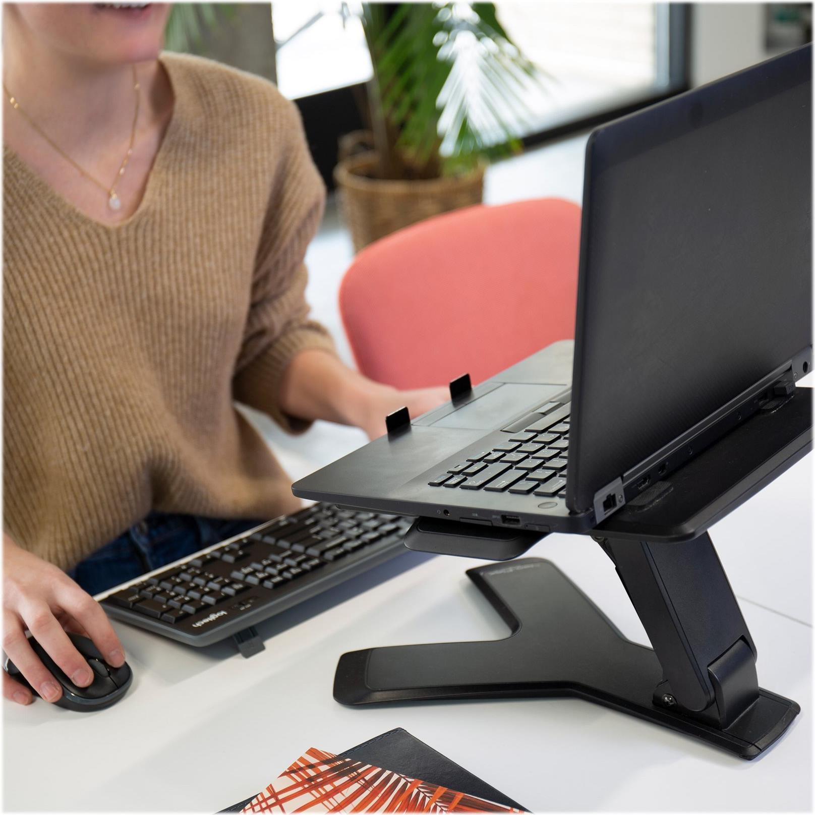 Der Bewegungsspielraums des Fuß von 15 cm bietet eine wirkliche ergonomische Einstellung - heben und neigen Sie die Notebookanzeige auf Augenhöhe, um den Komfort und die Produktivität zu verbessern.