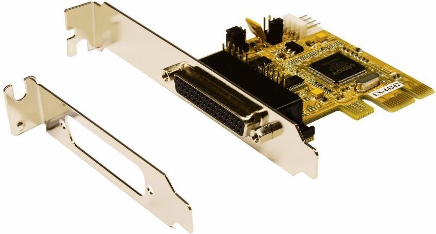 Die EX-44342 PCI-Express I/O-Karte stellt zwei serielle RS-232 High Performance UART 16C550 Ausgänge zur Verfügung. Sie ist entwickelt worden um zwei weitere serielle Ports für PC, kleine Workstation oder Server über den PCI Express Bus zu erweitern. Die Karte ist voll PCI-Express Plug-and-Play kompatibel und hat keine Probleme mit IRQ und I/O Adressen Konflikten. Zusätzlich ist +5V oder +12V auf Pin 9 des seriellen Steckers konfigurierbar für ein POS System (Power over System). Mit der EX-44342 wird ein Low Profile Bügel mitgeliefert damit die Karte auch in ein schmales PC Gehäuse von 8 cm eingebaut werden kann.