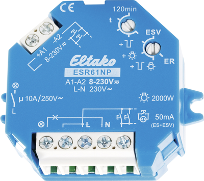 AP-/UP-Stromstoß-Schalter ESR61NP, 1 Schließer 10 AFür Unterputz-/Aufputz-Montage. Geringes Schaltgeräusch, keine StandBy-Stromaufnahme, nullspannungsschaltend. Ansteuerung mit 230 V, zusätzlicher Steuereingang 8 - 230 V/UC. Versorgungs- und Schaltspannung 230 V. Zeiteinstellung der Rückfallverzögerung bis 120 Minuten. Max. 50 mA Glimmlampenstrom am Steuereingang. Die Verzögerungszeit kann ausgeschaltet werden, so dass die Funktion Stromstoßschalter (ohne Glimmlampenstrom) ausgeführt wird. Zusätzlich ist die Funktion Schaltrelais wählbar. Ausschaltvorwarnung und Taster-Dauerlicht zuschaltbar.Technische Daten: Ausführung: AP-/UP-Stromstoßschalter 1 Schließer 10 ABetriebsspannung: 8 - 230 V/UC oder 230 VKontaktart: 1 SchließerProduktabmessung, Breite: 55 mmProduktabmessung, Länge: 45 mmSchaltleistung: (Glühlampen) 2000 WSchaltspannung: 250 V/ACSchaltstrom: 10 ATyp: ESR61NPHinweis: Kontakte nicht potenzialfrei.